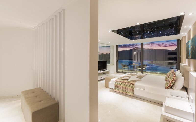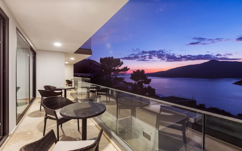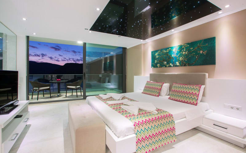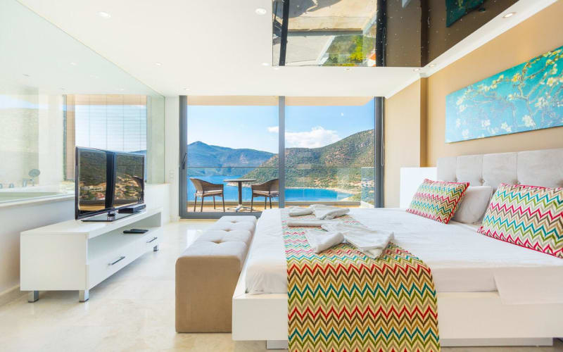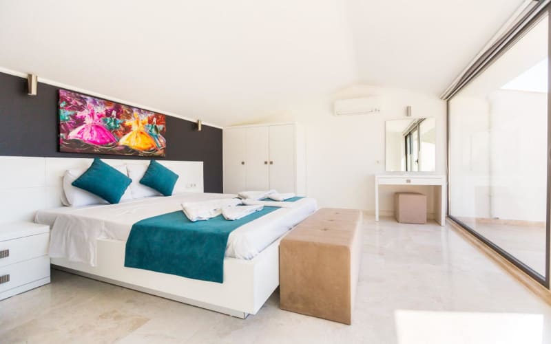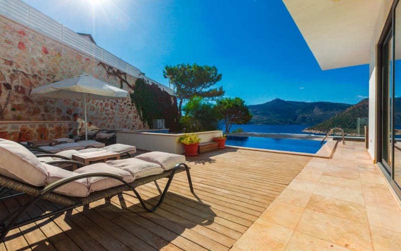 Kalkan´ın en güzel koylarından biri olan Kalamar´da bulunan kiralık tatil villamız 5 yatak odalı olup 10 kişi kapasitelidir ve Kalamar Paljı´na yürüme mesafesindedir. Kiralık villamız son derece lüks ve zevkle döşenmiştir ve oldukça kaliteli bir tatil villasıdır. villamızın tüm yatak odaları suit olup tamamından deniz manzarasını izleyebilirsiniz. Toplamda beş yatak odası bulunan Villa Maris´in salonu Amerikan tarz olup mutfağı açık tarzdadır. Buradan doğruca havuz terasına çıkış bulunur, havuz terası oldukça kullanışlı olup ayrıca havuza entegre jakuzisi vardır. Villamızın çatı terasında bar tezgahı, şezlonglar, oturma grubu yer alır. Kalabalık aileler veya geniş arkadaş grupları için oldukça idealdir. Ayrıca villamızın iki araçlık otoparkı mevcuttur. Villamızın bahçesinden merdiven ile plaja yürüyerek inebilirsiniz. Plaja yürüyerek yaklaşık 250 metredir.