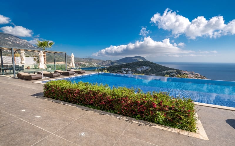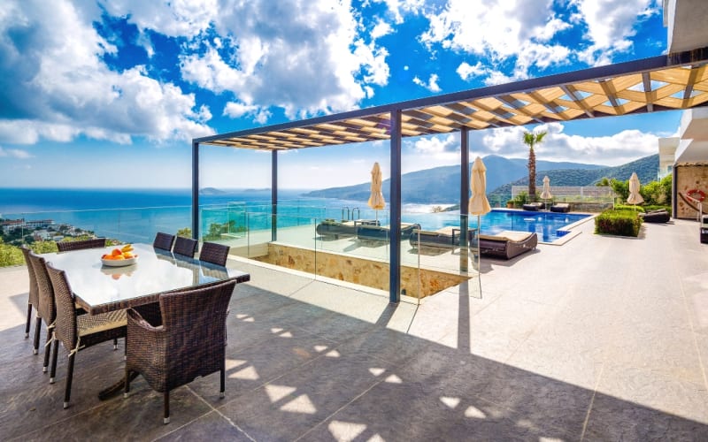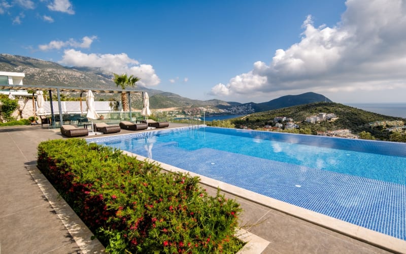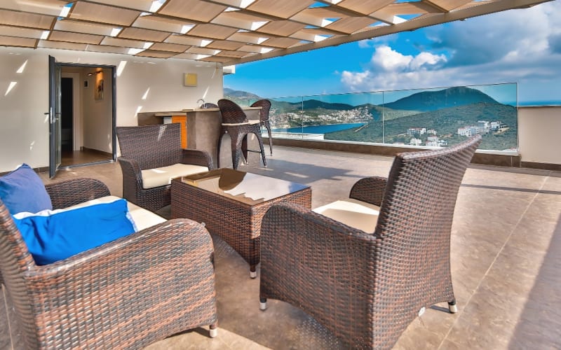 muhteşem manzara ve eşsiz bir lokasyondadır.. Kalkan Koyu’nu, denizi ve adaları