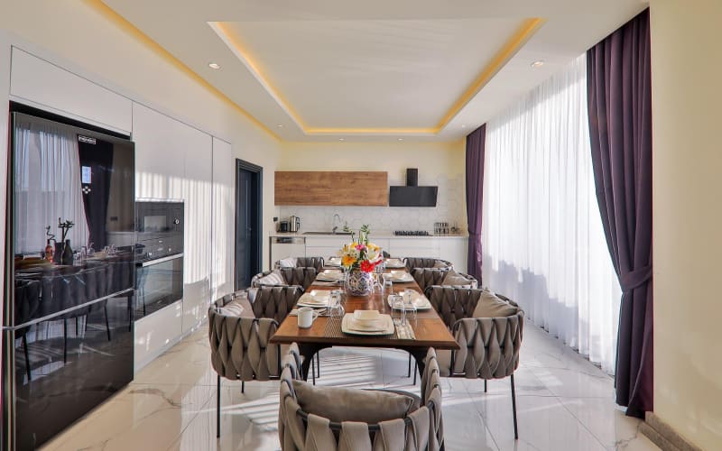 Mutfak : Tüm ihtiyaçlarınız için özenle yerleştirilmiş lüks bir Amerikan tipi mutfak vardır. Mutfak içerisinde buzdolabı, ocak, fırın, su ısıtıcısı yemek takımları gibi tüm imkanlar mevcuttur.