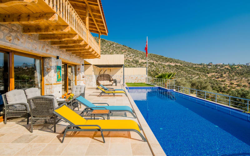 Kalkan, Ulugöl'de bulunan kiralık villamız 3 yatak odalı ve 6 kişilik kapasiteye sahiptir. Doğa içerisinde bulunan villamızın havuz terası korunaklı olup muhafazakar aileler için idealdir. Bütün yatak odalarında özel tuvalet-banyosu bulunan villamızın 2 yatak odasında jakuzisi bulunmaktadır. Hamam ve saunaya sahip olan villamızda sevdikleriniz ile güzel bir tatil geçirebilirsiniz. Minik misafirlerimizin de düşünülmüş olduğu villamızda çocuk havuzu ve geniş bahçe alanında oyun parkı bulunmaktadır. Misafirlerimizin ihtiyaç duyabileceği birçok şeyin düşünülmüş olduğu Villa Yeşil 1 in Kalkan şehir merkezine uzaklığı yaklaşık 4 km'dir.