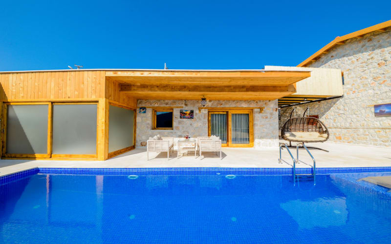Kalkan, Ulugöl'de konumlandırılmış olan kiralık villamız 2 yatak odalı ve 4 kişi kapasitelidir. Havuz terası korunaklı olan villamızı muhafazakar aile ve çiftler gönül rahatlığıyla tercih edebilirler. Balayı çiftleri için de ideal olan villamızın ebeveyn yatak odasında jakuzisi bulunmaktadır. Doğa içerisinde sevdikleriniz ile keyifli bir tatil geçirebileceğiniz villamızın geniş bahçe alanında masa tenisi, oturma grubu ve oyun parkı bulunmaktadır.