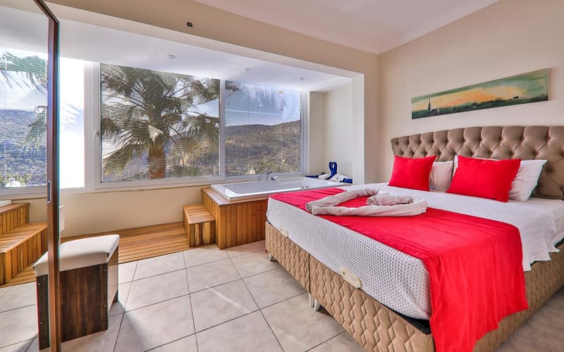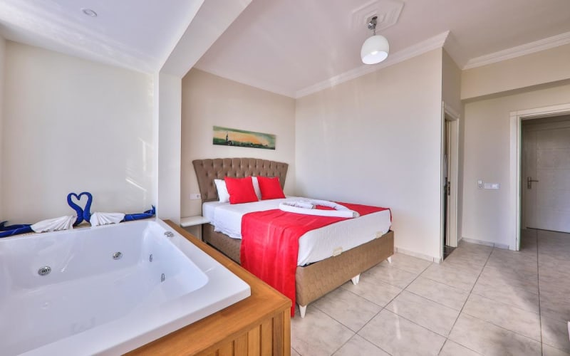 1.Yatak Odası(Aile): 1 adet çift kişilik yatak, klima, makyaj masası, komodin, elbise dolabı, jakuzi, banyo tuvalet bulunmaktadır.