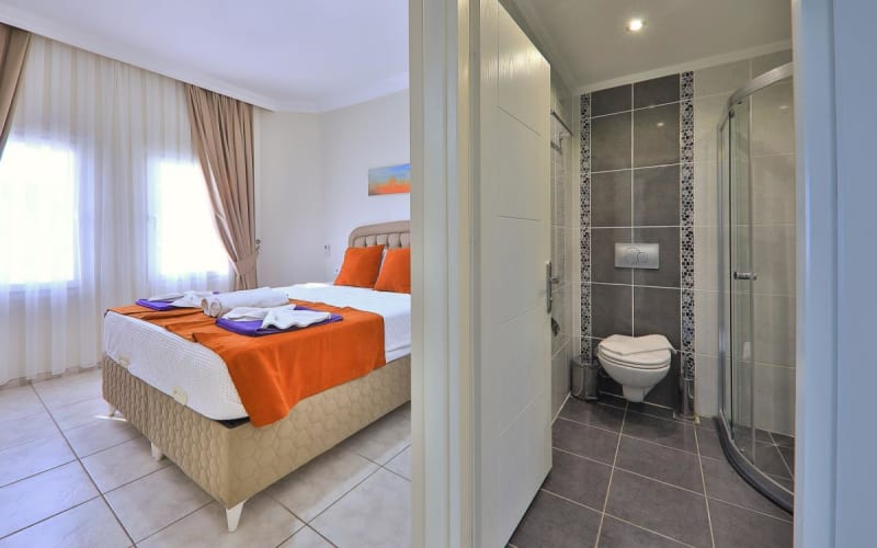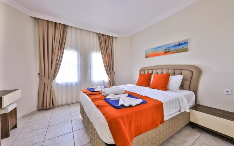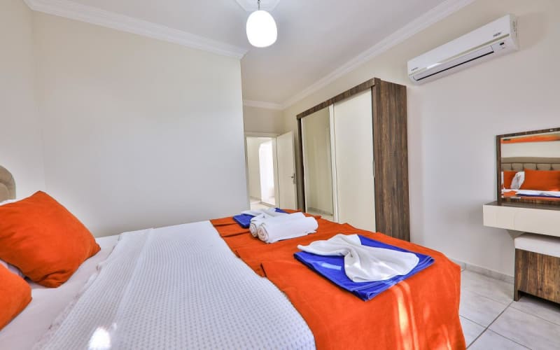 2.Yatak Odası(Aile): 1 adet çift kişilik yatak, klima, komodin, elbise dolabı, makyaj masası, banyo ve tuvalet bulunmaktadır.