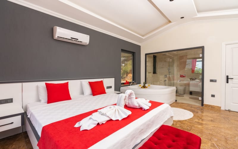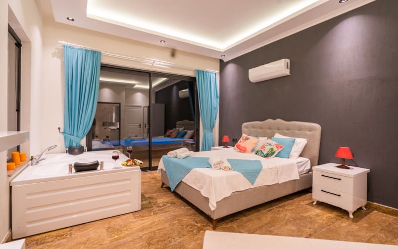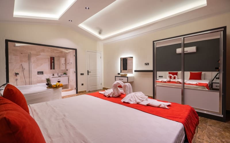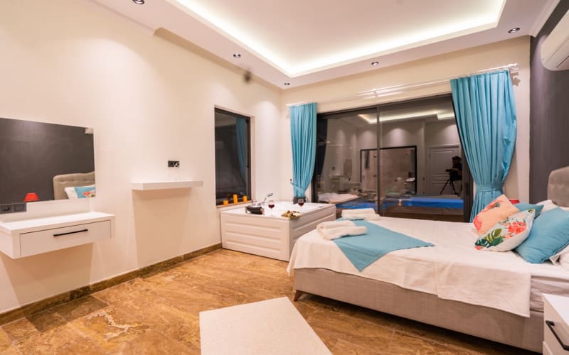 2. Yatak Odası : 1 adet çift kişilik yatak, klima, elbise dolabı, makyaj masası, komodin, jakuzi, banyo ve tuvalet bulunmaktadır.