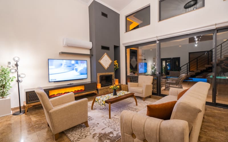 Salon : Havuz manzaralı salon içerisinde oturma grubu, uydu TV (LCD), kablosuz internet, klima, 6 kişilik yemek masası, wc&lavabo bulunmaktadır. Salondan havuz terasına çıkış yapılmaktadır.