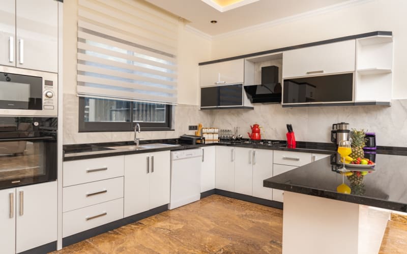 Mutfak : Ferah ve modern Amerikan mutfakta, buzdolabı, kahve makinesi, bulaşık makinesi, çamaşır makinesi, fırın, 4’lü ocak (ankastre), mikrodalga fırın, elektrikli su ısıtıcı, tava & tencere vb. mutfak ekipmanları, 6 kişilik yemek takımı bulunmaktadır.