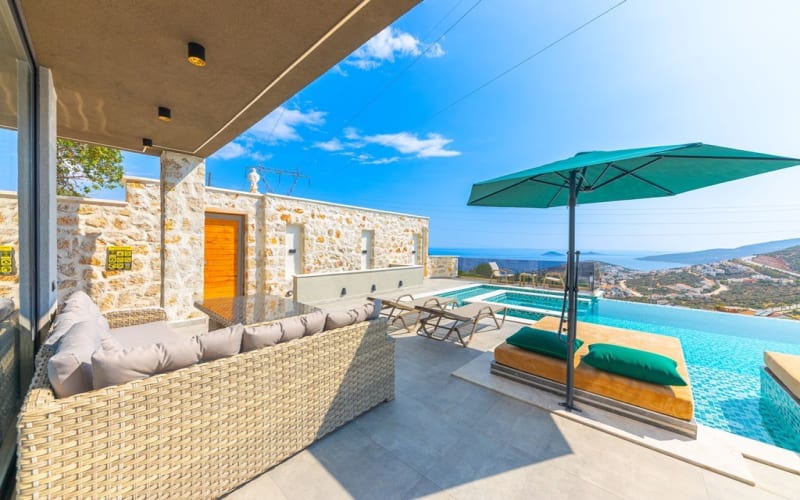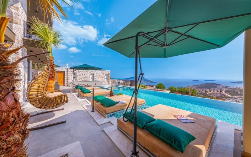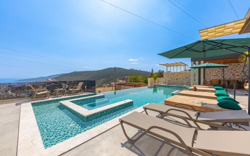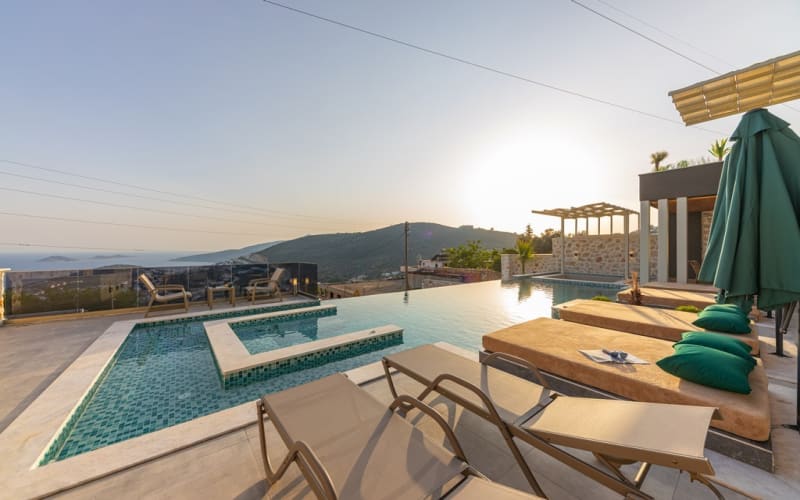 Havuz Katı Terası: Güneşlenme alanı, Özel havuz ve Özel bahçe bulunan villamızda 4 adet çift kişilik havuz içinde daybed, 2 şezlong,şemsiye ,salıncak,8 kişilik masa sandalye,oturma grubu,keyif köşesi,masa tenisi,taş barbekü,tezgah ve lavabosu bulunmaktadır.