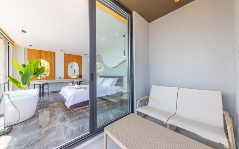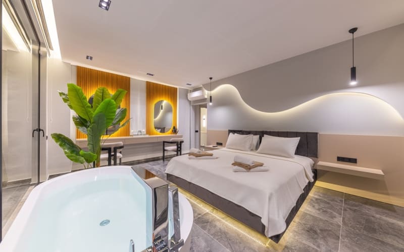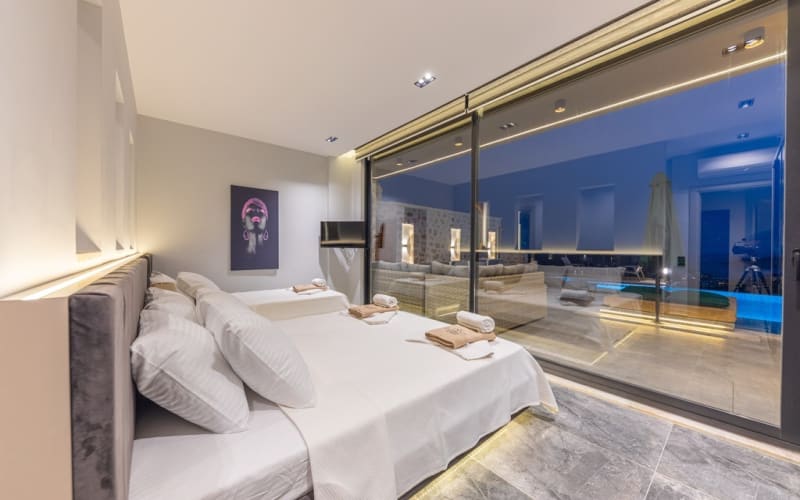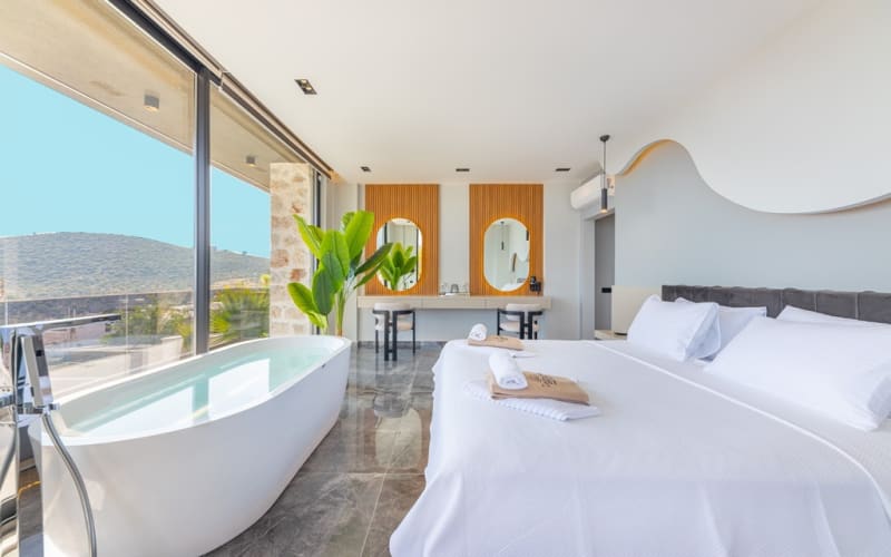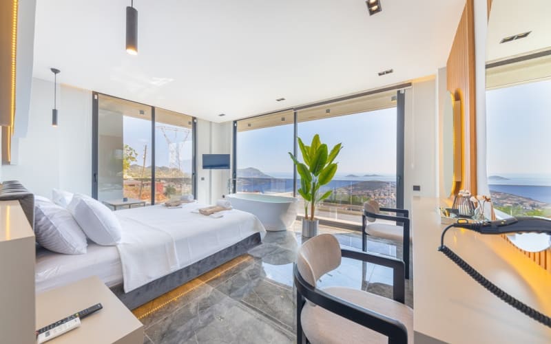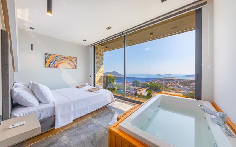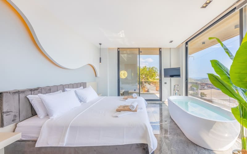 2. Yatak Odası :1 adet King Size Çift kişilik yatak, Özel Giyinme bölümünde Elbise Dolabı,TV,Sauna,Hamam kurnalı banyo,Özel tasarım küvet,Komidin,Makyaj masası,saç kurutma, Klima,deniz manzarası ve balkon bulunmaktadır.
