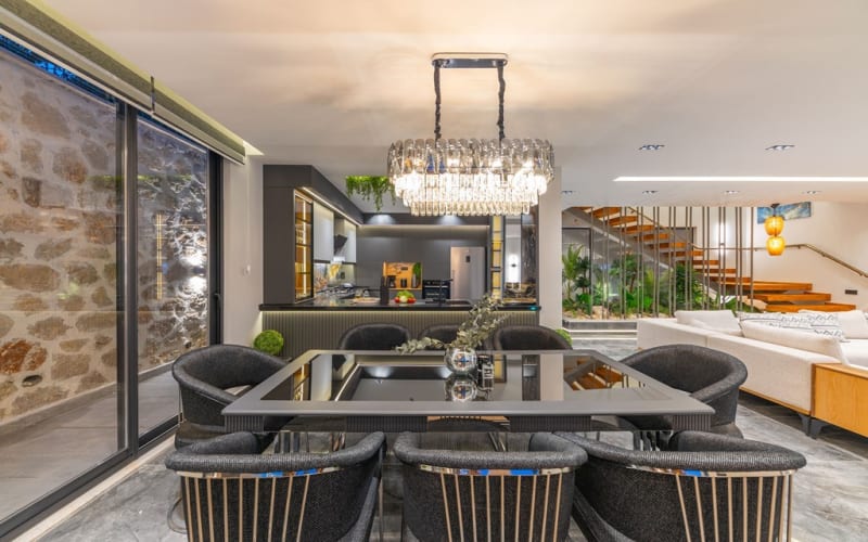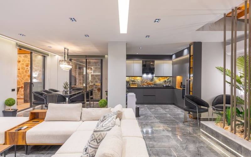 Detayları : L Oturma grubu, Uydu Smart TV , Klima, 8 Kişilik yemek masası,Kahve Köşesi, Görsel Şömine, WC & Lavabo,Çamaşır Odası (Yıkama ve Kurutma Makinesi mevcut) ve Havuz kenarına çıkış bulunmaktadır.