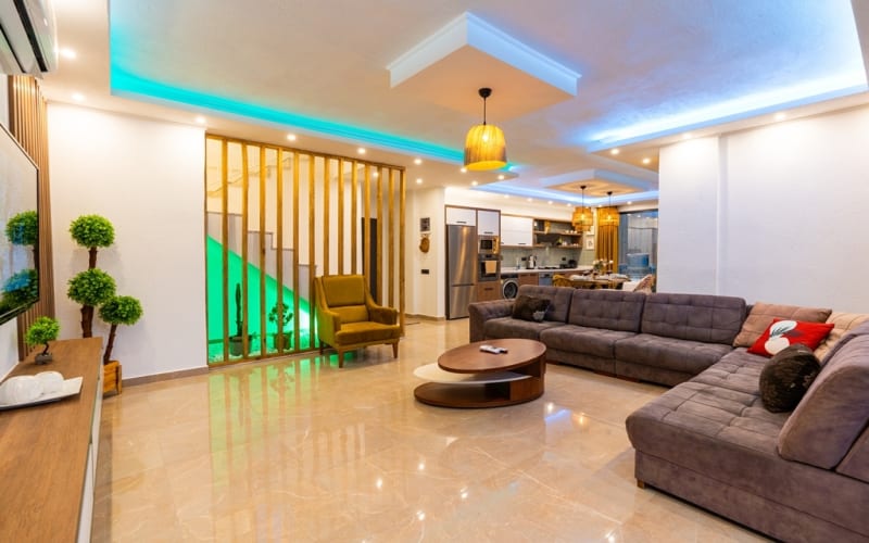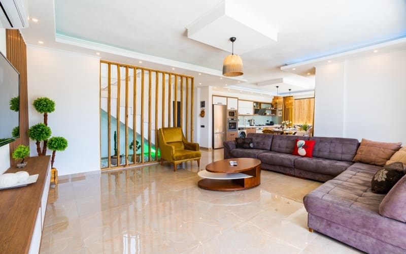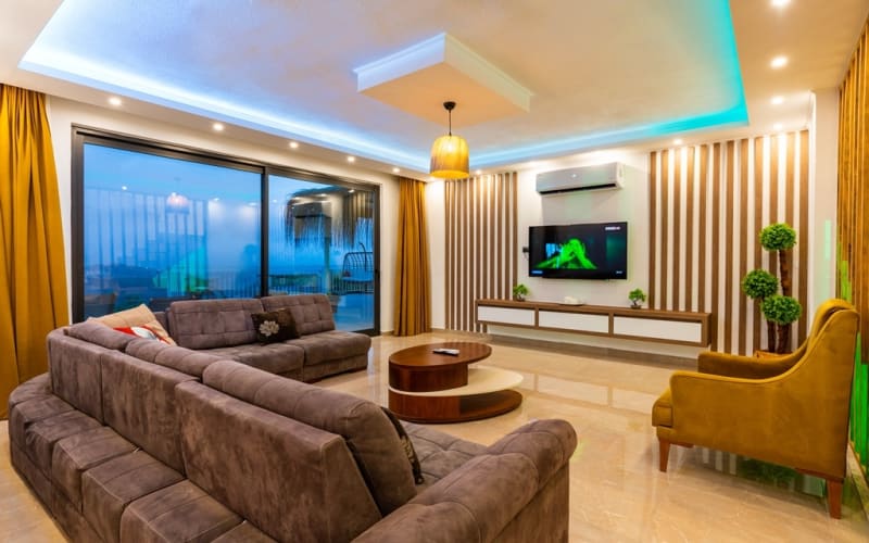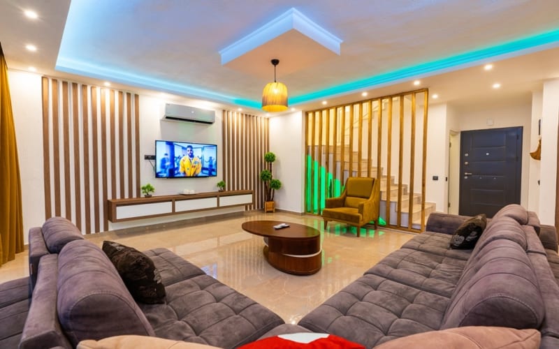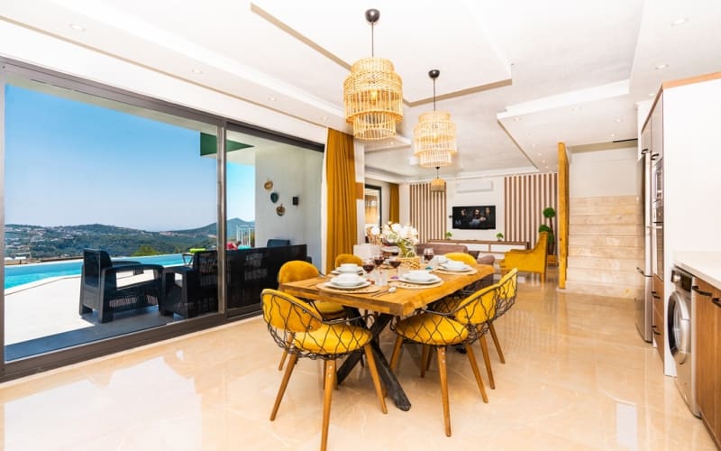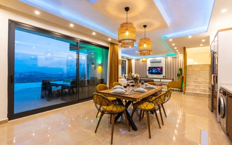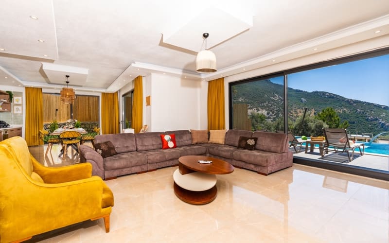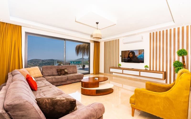 Salon : Villa Bu Yaz'ın modern ve lüks tasarımlı salonu, tatiliniz boyunca konforunuzu ve eğlencenizi düşünerek özenle dizayn edilmiştir. Rahat oturma grubu, uzun sohbetler veya rahatlamak için ideal bir alan sunar. Geniş bir TV ve DVD oynatıcı, eğlenceyi zirveye taşırken, klimalar her zaman ideal sıcaklığı sağlar ve internet erişimi ile dünyayla bağlantınızı sürdürebilirsiniz. Salonun en özel özelliklerinden biri, havuz terasına kolayca geçiş yapabilmenizdir. Bu sayede iç mekan ve dış mekan arasındaki sınırlar kaybolur ve tatilinizin keyfini her iki alanda da çıkarabilirsiniz.