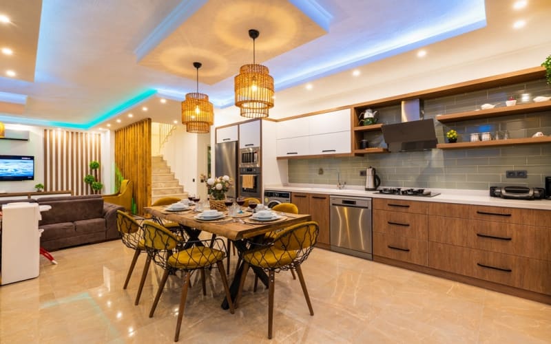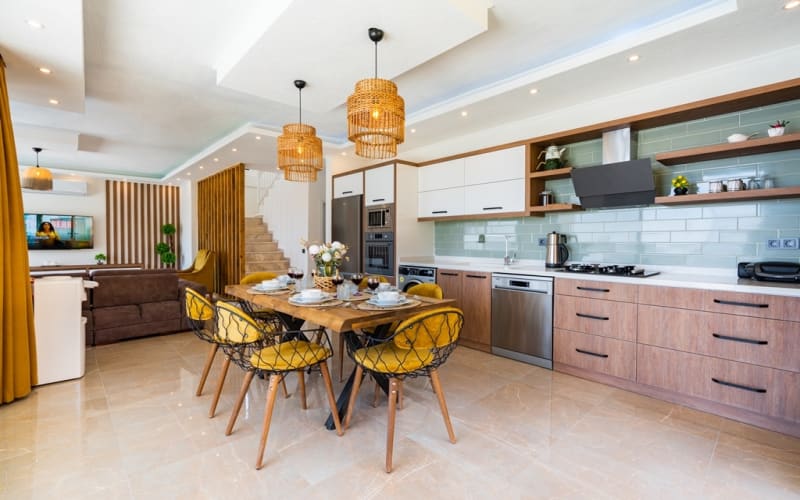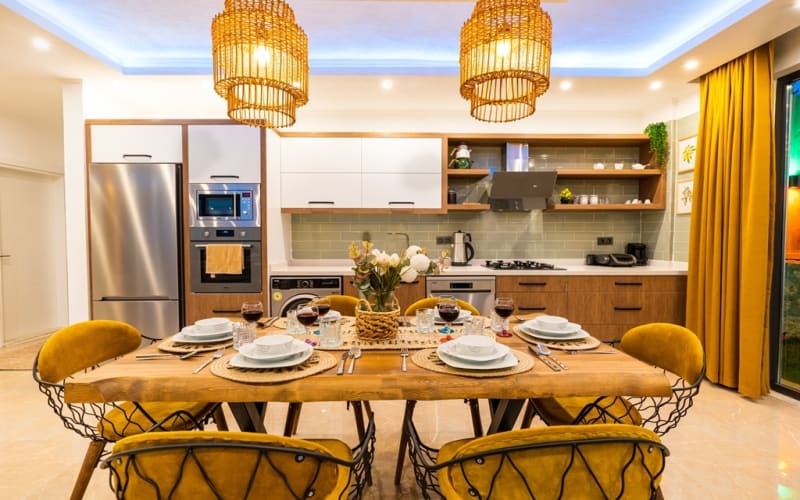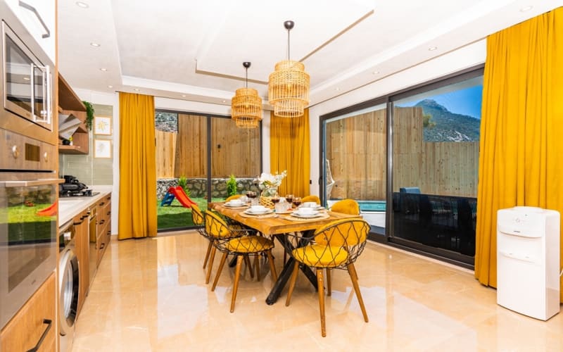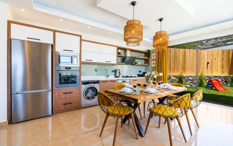 Mutfak :Villa Bu Yaz'ın Amerikan tarzı mutfağı, kendi evinizin konforunu aratmayacak şekilde tasarlanmıştır. Mutfakta geniş bir buzdolabı, kullanışlı bir bulaşık makinesi, çamaşır makinesi, modern bir ocak, fonksiyonel bir fırın, hızlı su ısıtıcısı, lezzetli tostlar yapabileceğiniz bir tost makinesi, ferah bir yemek masası, zarif yemek takımı ve yemek pişirme araç gereçleri gibi tüm olanaklar mevcuttur. Villa Bu Yaz'ın mutfağı, tatilinizde kendi yemeklerinizi hazırlayarak ev konforunu yaşamanız için gereken her şeyi sunar.