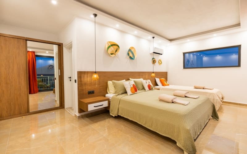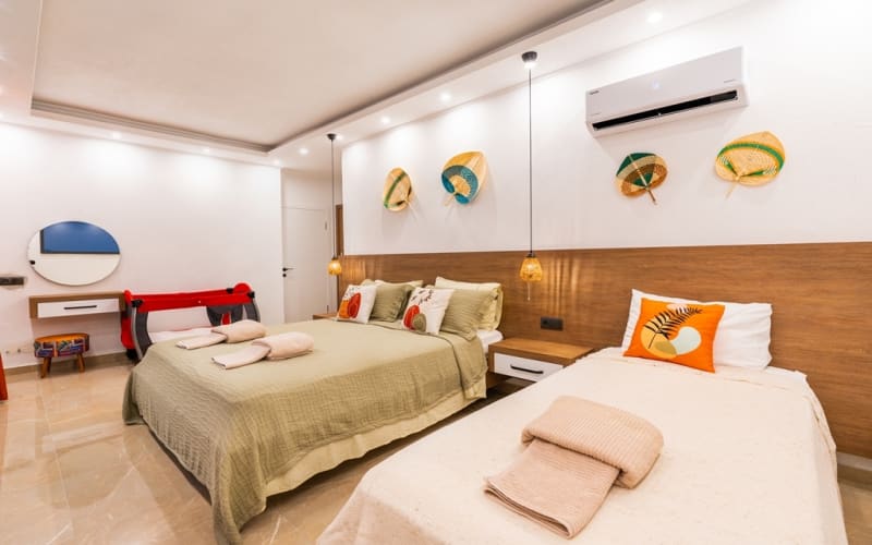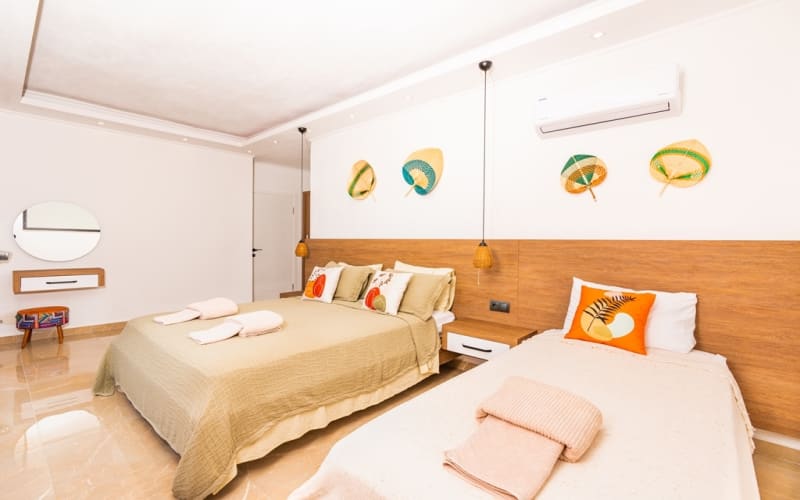 2. Yatak Odası: Bir adet çift kişilik yatak, bir adet tek kişilik yatak,klima, elbise dolabı,komodin, makyaj masası, banyo ve tuvalet bulunmaktadır.