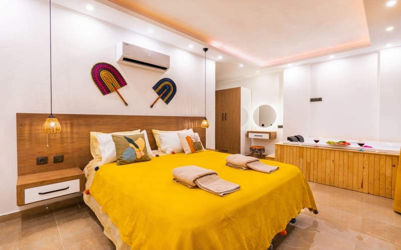 1. Yatak Odası: Bir adet çift kişilik yatak ,klima, jakuzı, komodin, elbise dolabı, makyaj masası, banyo ve tuvalet bulunmaktadır.