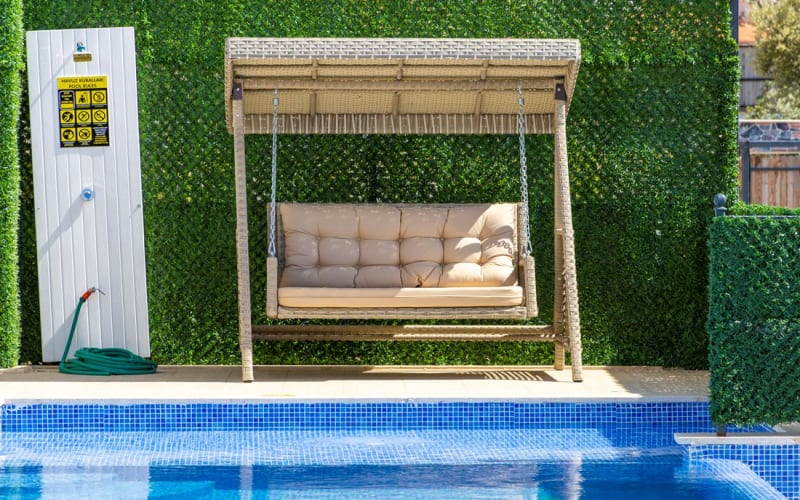 Terasında özel yüzme havuzu, şezlonglar, güneş şemsiyeleri,duş alma yerş mevcuttur, masa ve sandalyeler,salıncak, mangal bulunmaktadır.