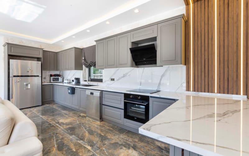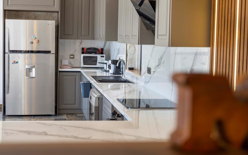 Amerikan mutfakta buzdolabı, bulaşık makinesi, fırın, 4'lü ocak, mikrodalga fırın, kettle, tost makinesi,kahve makinası,ekmek kızartma makinası, yemek masası, yemek takımları, çatal ve bıçak takımları, tencere ve tava takımları, bardaklar bulunmaktadır.