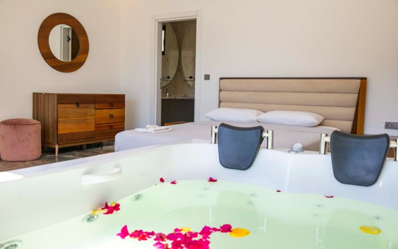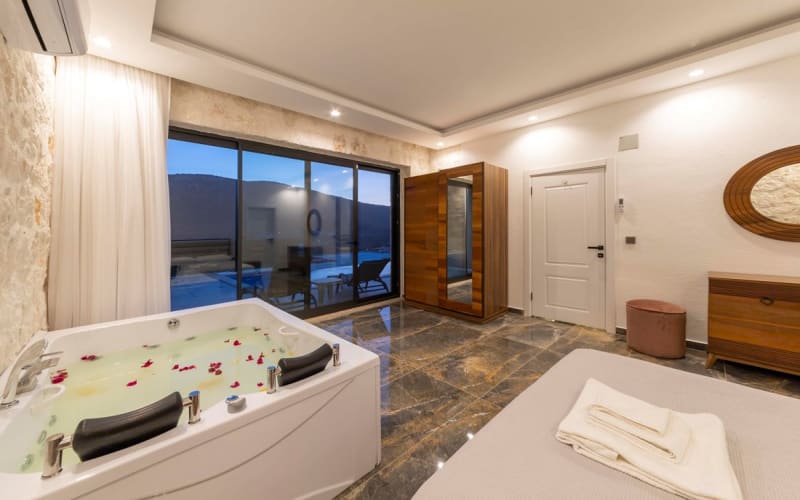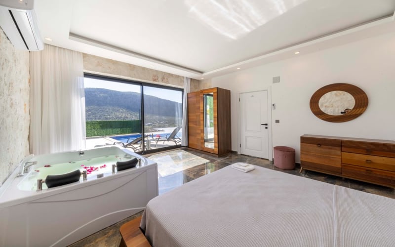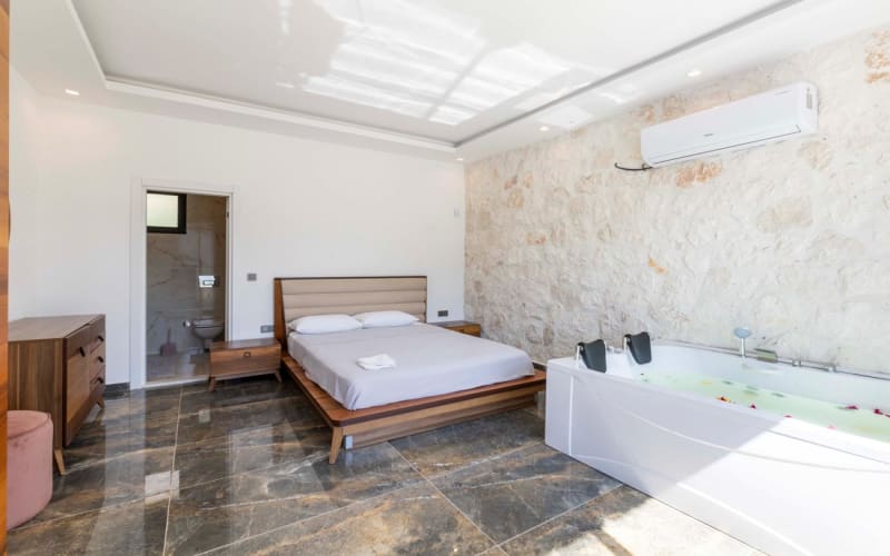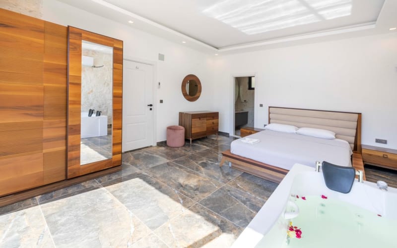 1.Yatak Odası: 1 adet çift kişilik yatak, klima, televizyon, komodin, makyaj masası, elbise dolabı, jakuzi, banyo ve tuvalet bulunmaktadır.