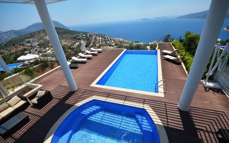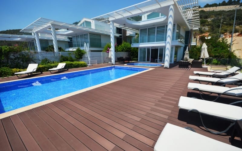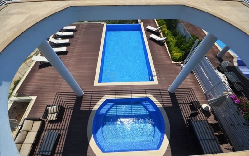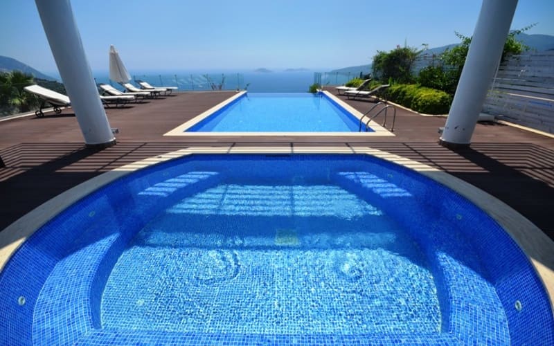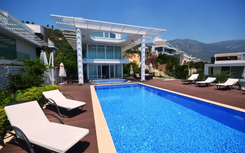 dizaynı, geniş ve jakuzili havuzu ile ön planda olan tatil villamız, Siz