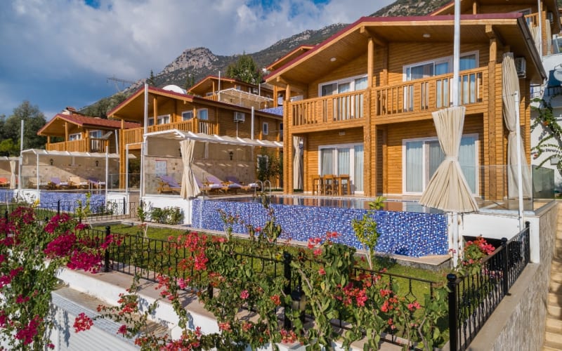 Antalya Kalkanda bulunan kiralık ahşap tatil villamız 2 yatak odası ile 4 kişilik kapasiteye sahiptir. Muhteşem deniz ve şehir manzarasına sahip olan kiralık şirin yazlık evimiz, balayı çiftlerimiz ve küçük ailelerimiz için idealdir. Villamızın olduğu yerde 14 adet villa yapılmış ve havuzları birbirini görmeyecek şekilde perde sistemi ile muhafazakar hale getirilmiştir.  3 er sırayla arka arkaya tasarlanmış tatil evlerimizin yanlarında veya önlerinde yeşil bahçeleri de mevcuttur. Güvenliğiniz için gece ve gündüz güvenlik hizmeti de verilmektedir.